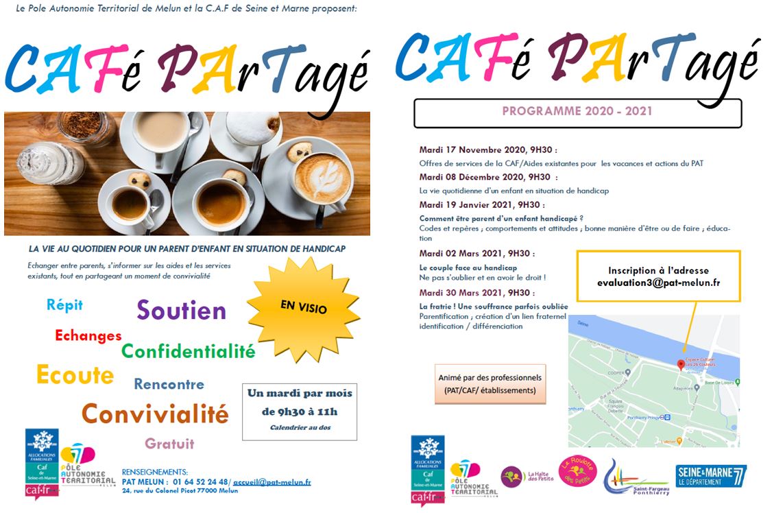 Nous avons le plaisir de vous communiquer les premières dates du Café partagé pour l’année 2021 Café Partagé was last modified: septembre 14th, 2021 by Association RIVAGE Vous pourriez aussi aimer Conférence plaisirs sous la couette JOURNÉE DE L’AIDANT TOUS PAREILS, TOUS DIFFÉRENTS SALON DES SÉNIORS MELUN L’EQUILIBRE EN MOUVEMENT Journée de sensibilisation aux différentes formes de Handicaps Infos Parkinson VACCINATION COVID-19 Atelier sophrologie Semaine du 5 au 11 novembre 2012
